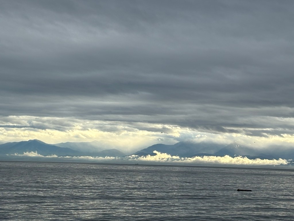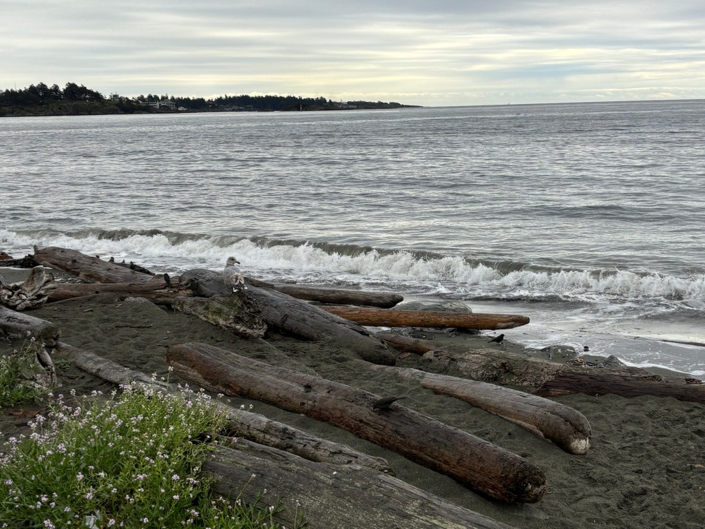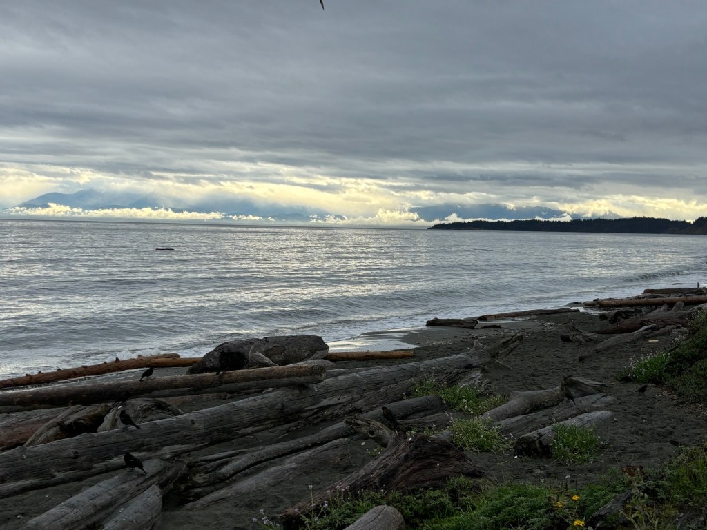 We slowly made our way over to Blue Haze Farm, and stopped on the Esquimault Lagoon, and I painted the misty Olympic Mountain range in the distance.