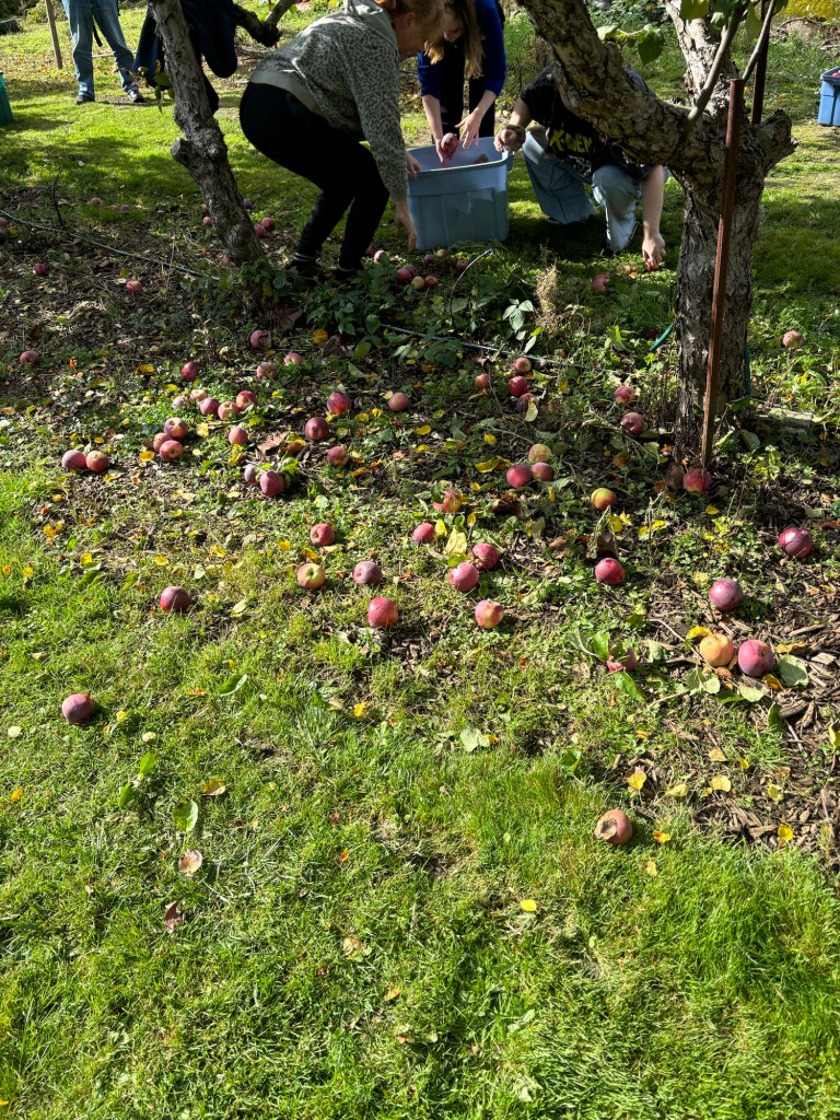 Monday the rain finally stopped, and we were able to spend time outside, so we were put to work picking apples! Rick and RJ took a batch to the juicers, and Gillian and Theresa supervised some enthusiastic young people who came for a visit, and apples.