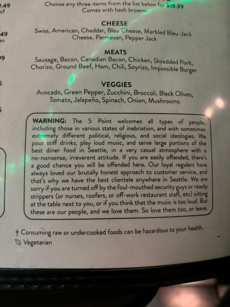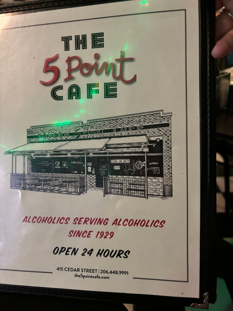 We started our day with a short walk over to the oldest Dive bar in Seattle for breakfast. The 5 Points Cafe and Tavern where apparently you can have a liquid breakfast there if you would like. (We did not)