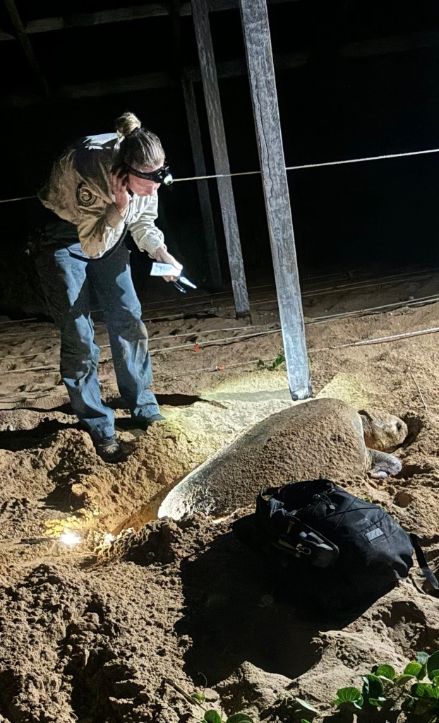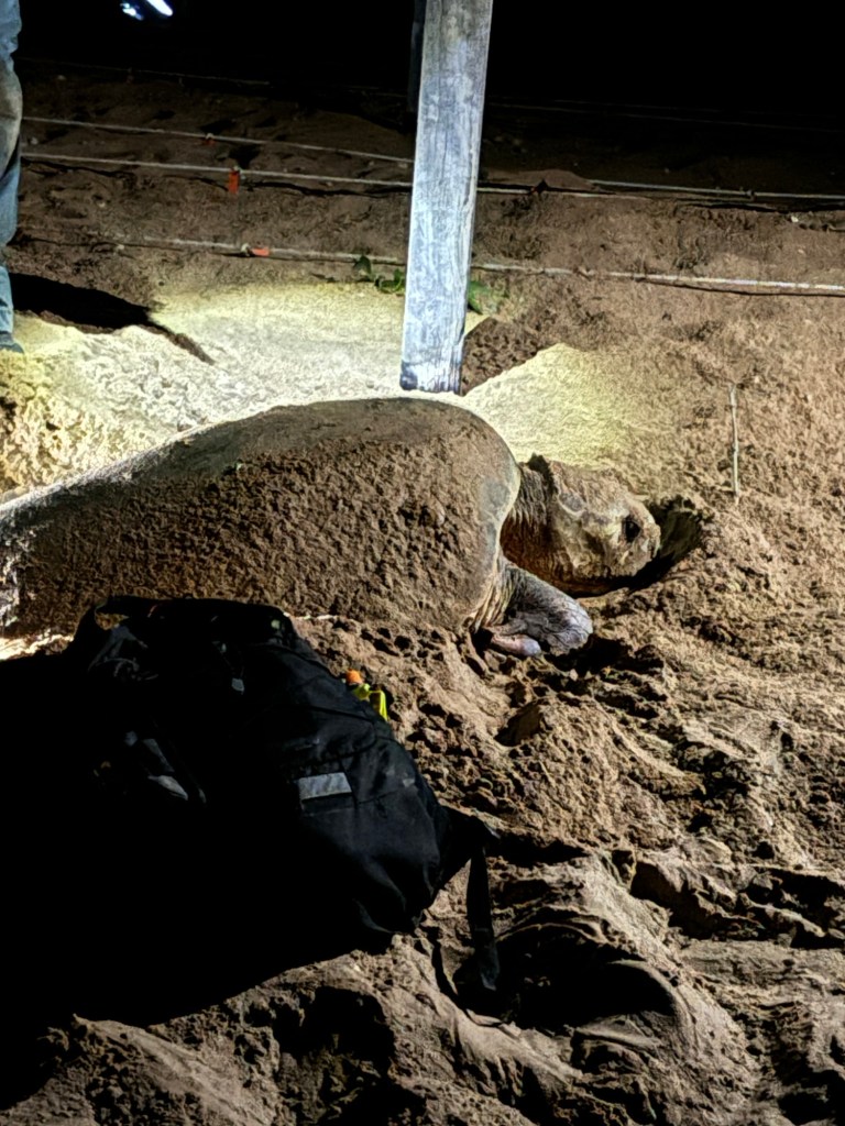 A little walk down the beach, in the dark! We got to our turtle. And while she began her digging, the ranger filled our minds with many turtle facts.