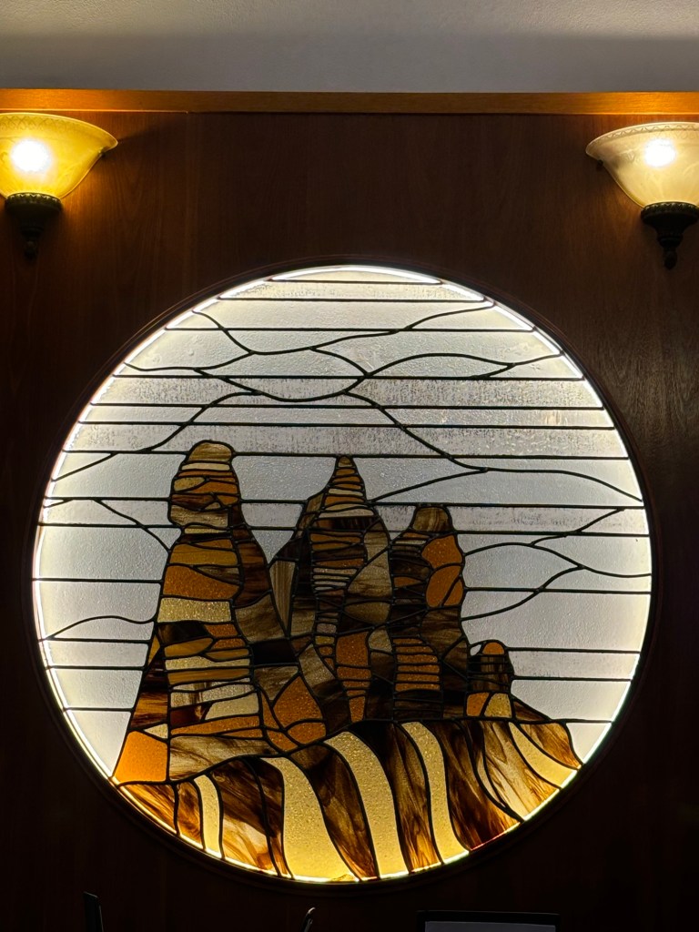The Henry, at the Blue Mountain Inn. The special today was Steak! Twist my rubber arm! We both had the special. It was delicious! The Henry was also filled with delightful stain glass… and you know us, we love stain glass!
