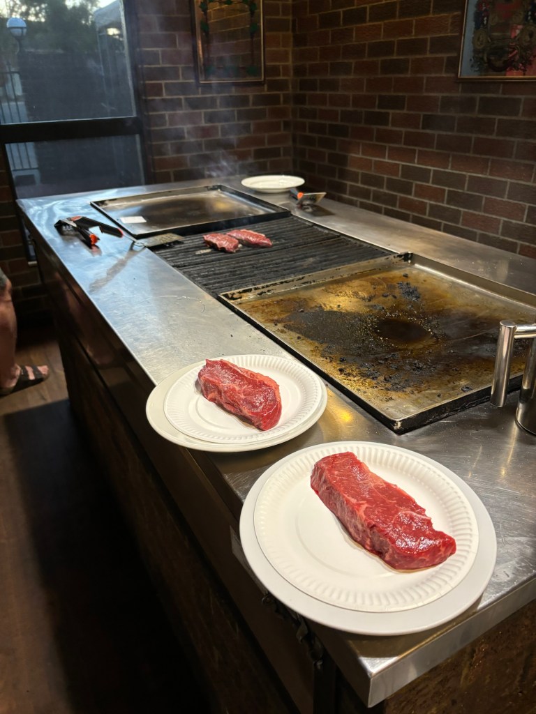 We then headed to the restaurant at the hotel (the only one in town). Where the menu is “interesting”. You can get five items from the menu (all include wheat products… so not for me) or you can buy some raw meat, and cook it yourself and have the sides from the Buffet… so we did!