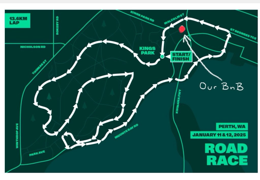 That so DID NOT happen… the AusCycling Road National Cycling Championships were happening in Perth… and our BnB was smack in the middle of it, and all roads were closed, and we could not get to our place. So. Plan B, we found a city parking lot within walking distance… and walked over. Exhausted. Nap, then some groceries and rescued our car in the evening after they had cleared up the cyclists.