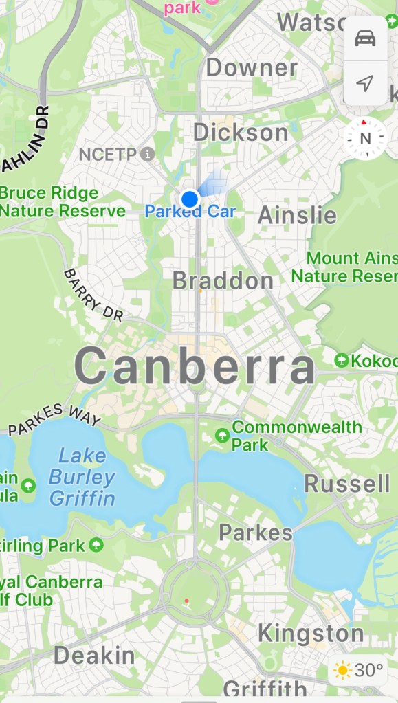 The Capital Hill is a large circle, with the Parliament in the Centre surrounded by parks and boulevards. North (not quite due north) across a Lake is another smaller slightly smaller Circle, which is the Center of the CBD… then further north, along the boulevard is another circle, which is where we are staying, and then the suburbs beyond… (then there is the urban sprawl beyond that )