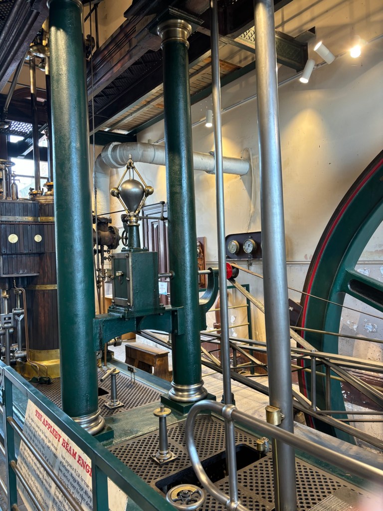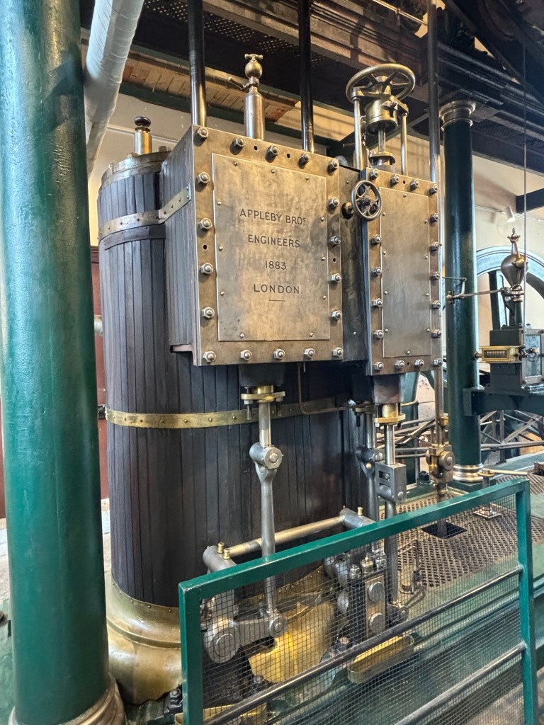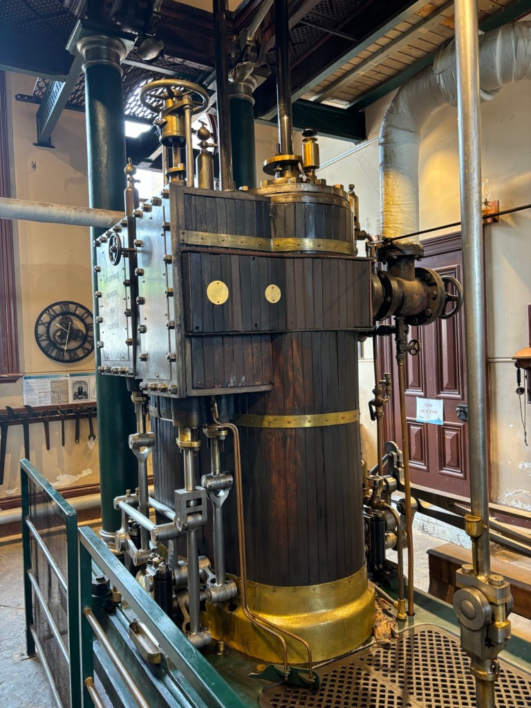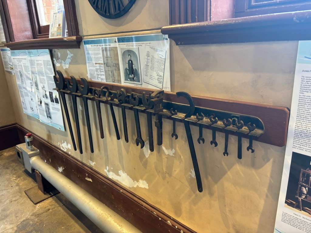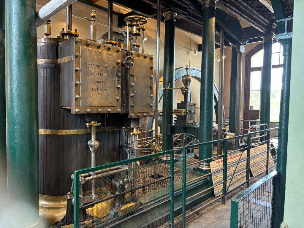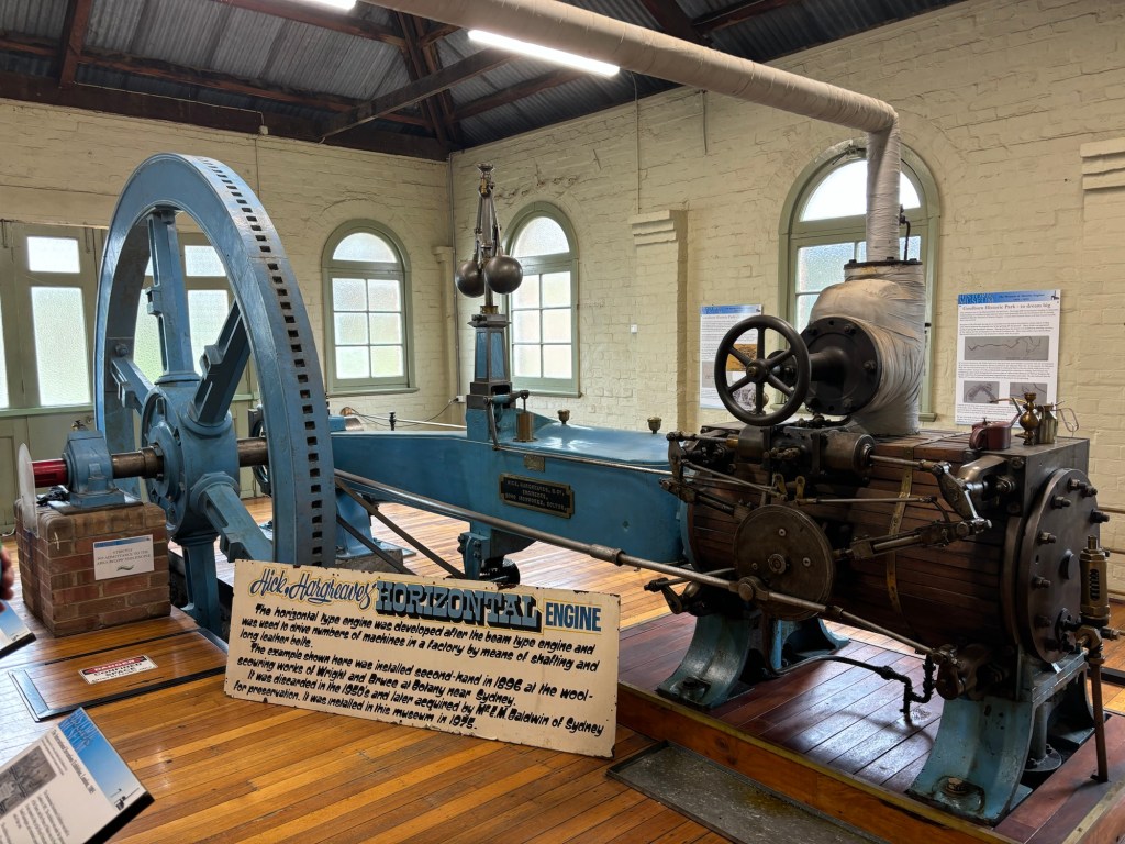 We also are fortunate to also have a horizontal engine built by Hick, Hargreaves & Co, England in 1866. While not original to the site it demonstrates an earlier type and different style of a stationary steam engine.