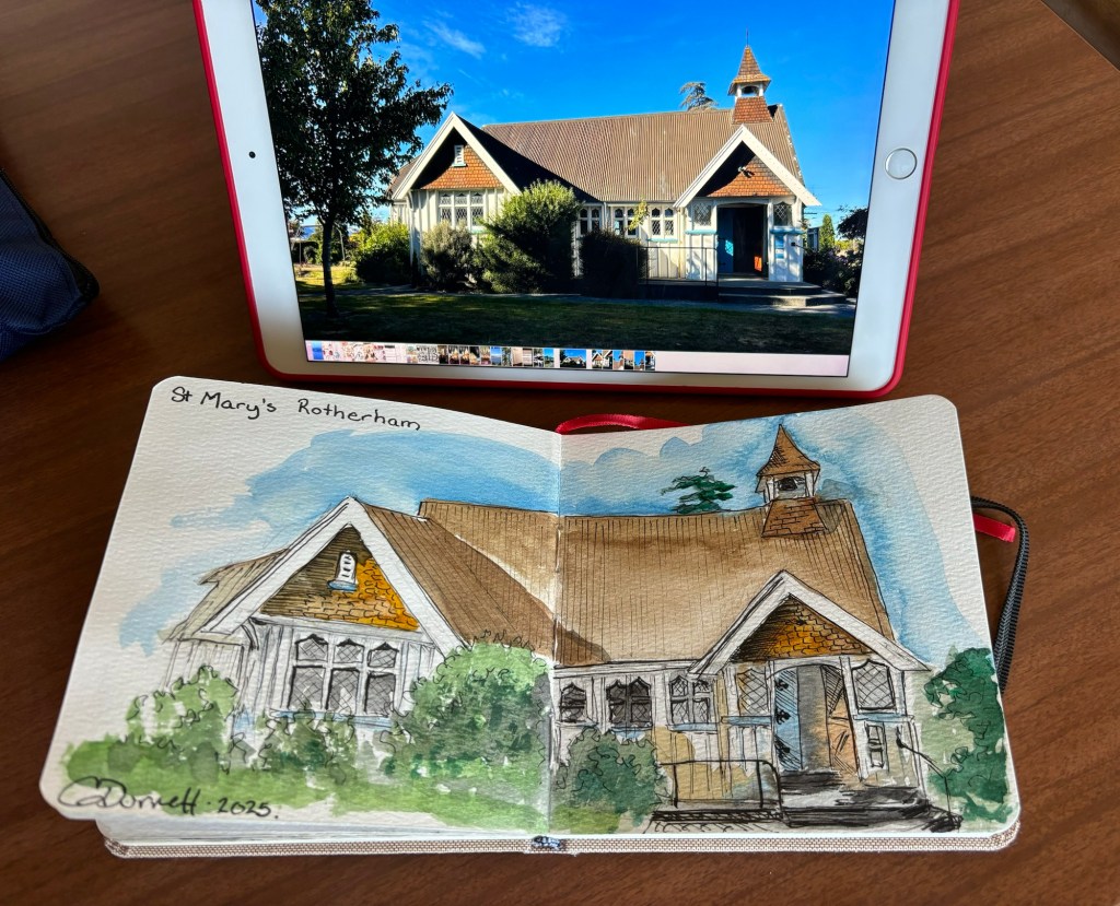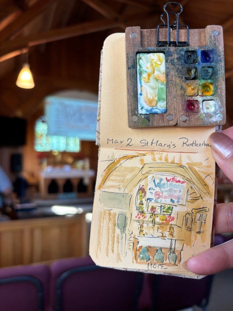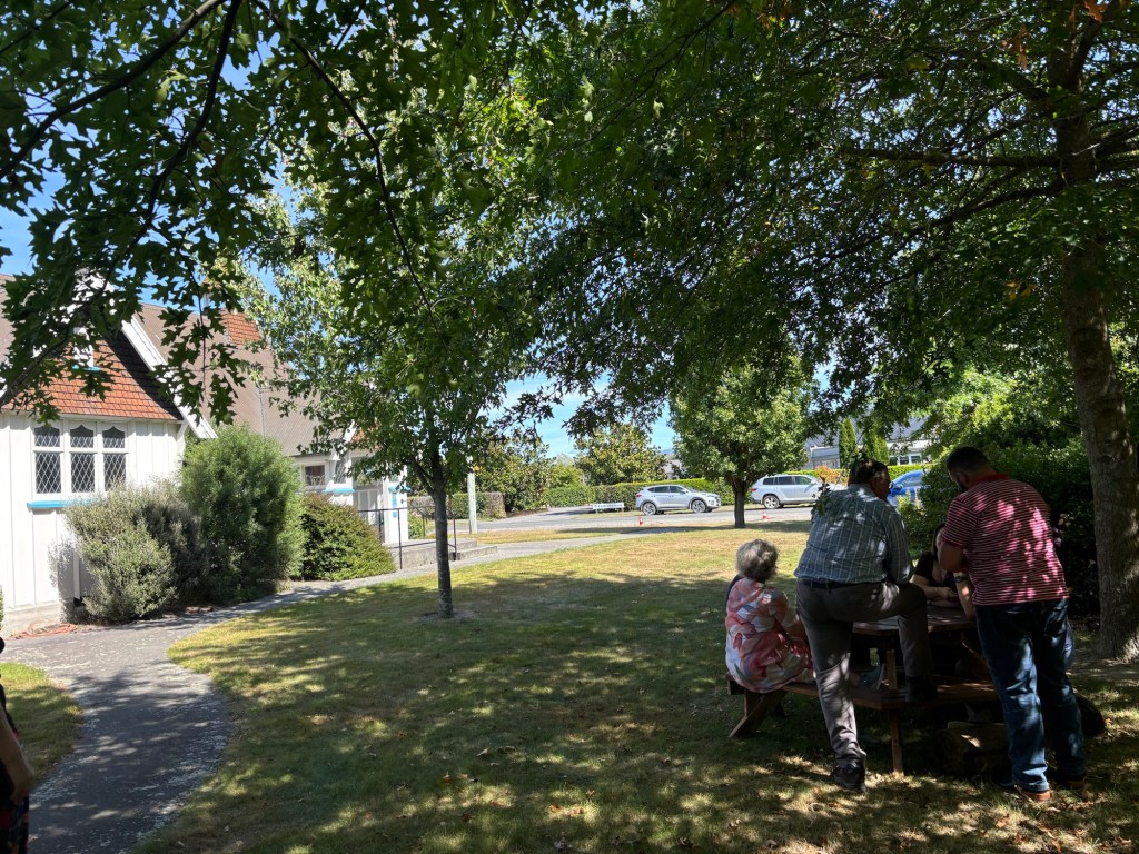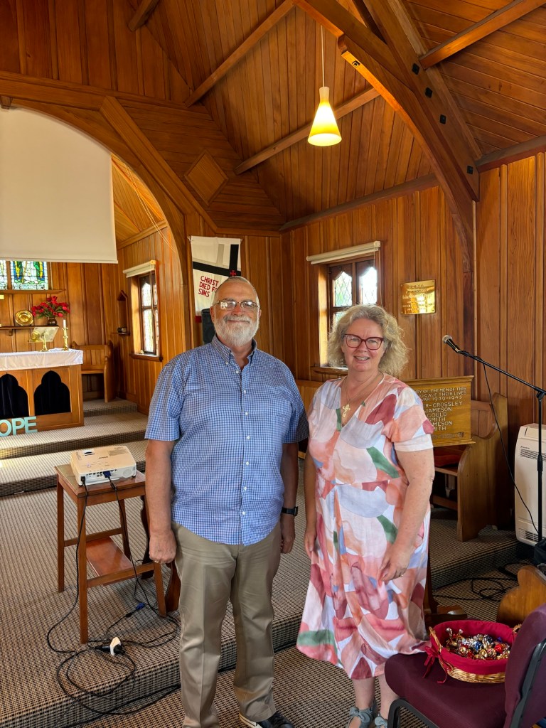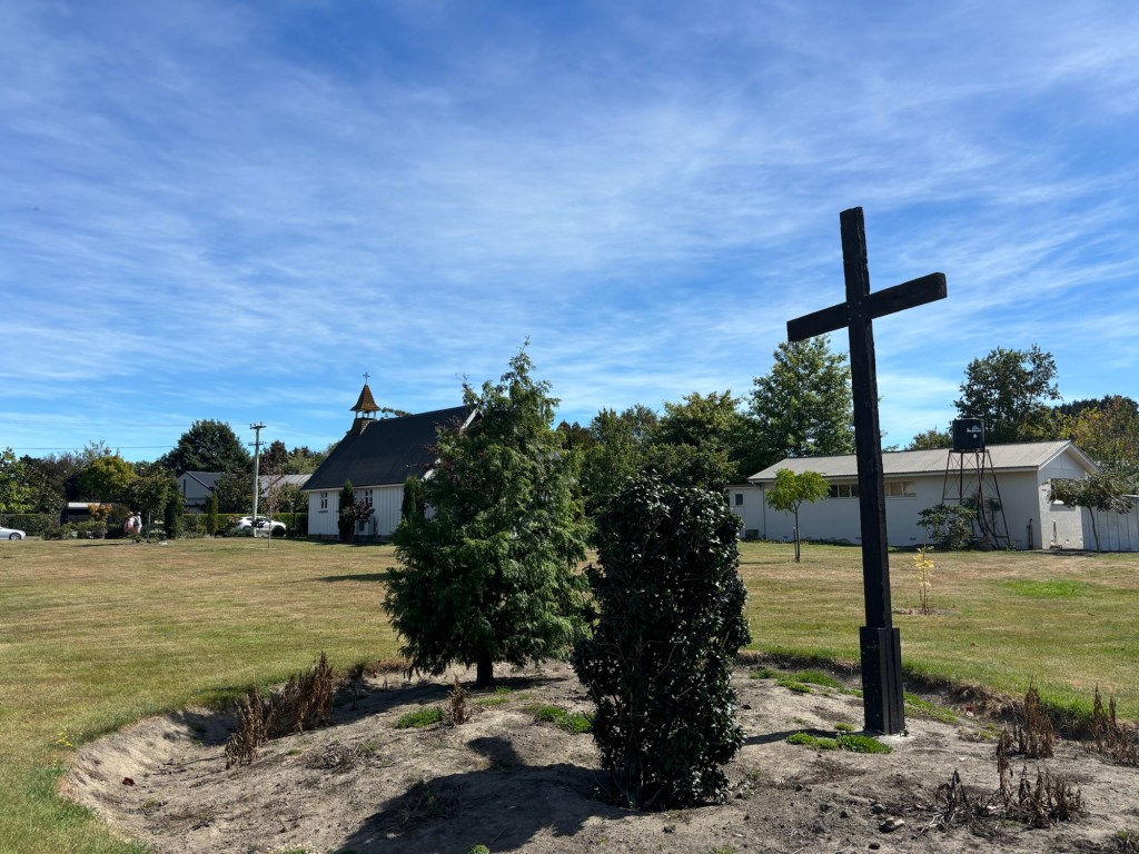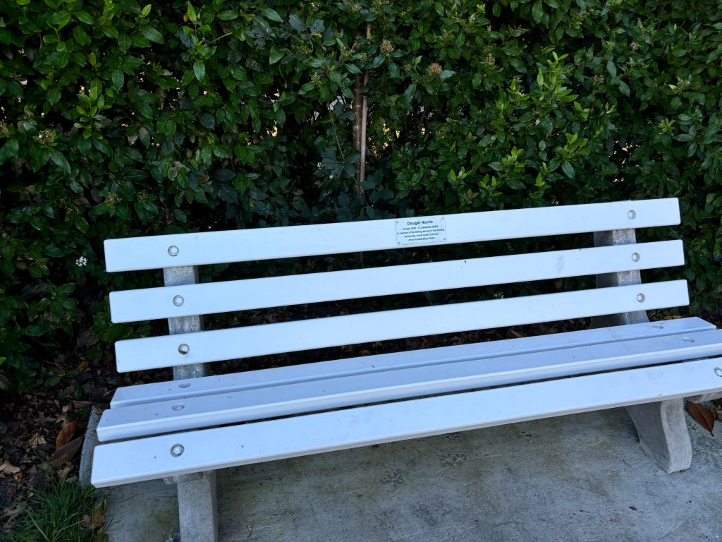 St Mary’s church!Beautiful gardens by RossA mini insideCuppa on the lawnThe clergy team this morning, Dawn celebrated, Rick preached!This lovely bench called to me… it was in memory of the husband of a lovely woman Diane, who I now call friend. The dog’s foot prints are in the cement below.The view from the bench.