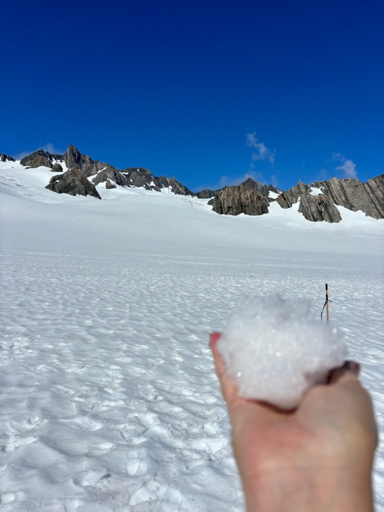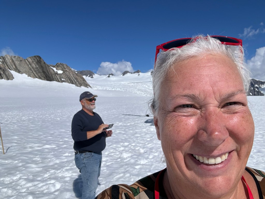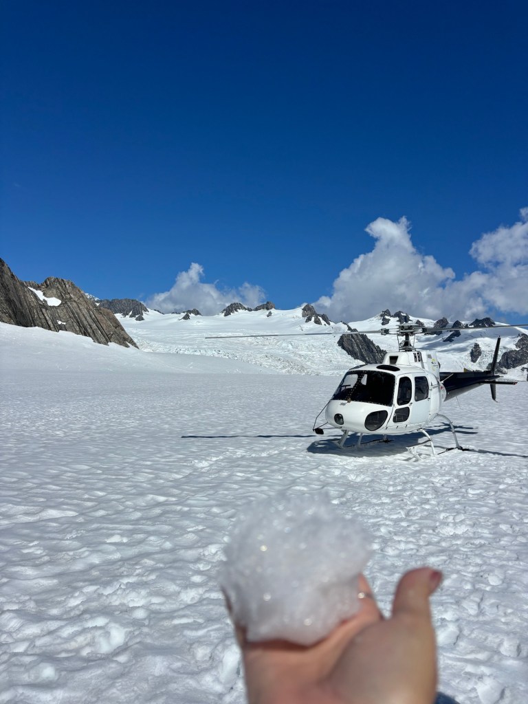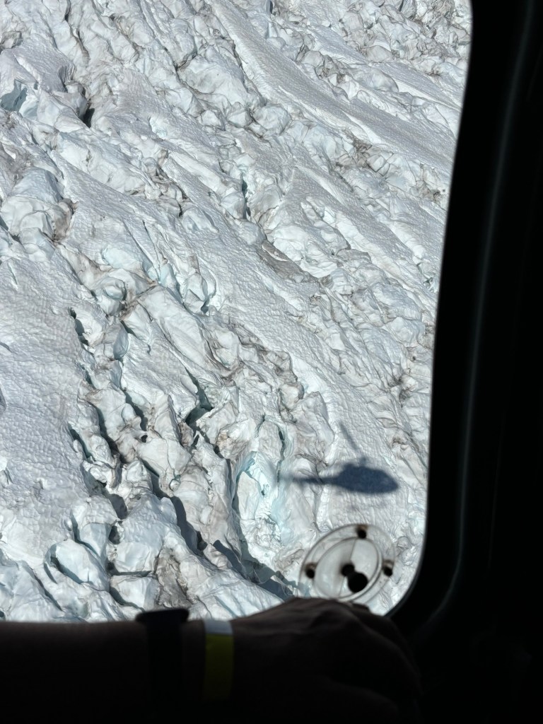 The ride took us over where we had been walking then up to the Glacier itself. We landed, and took pictures. The family that was with us made a wee snowman!