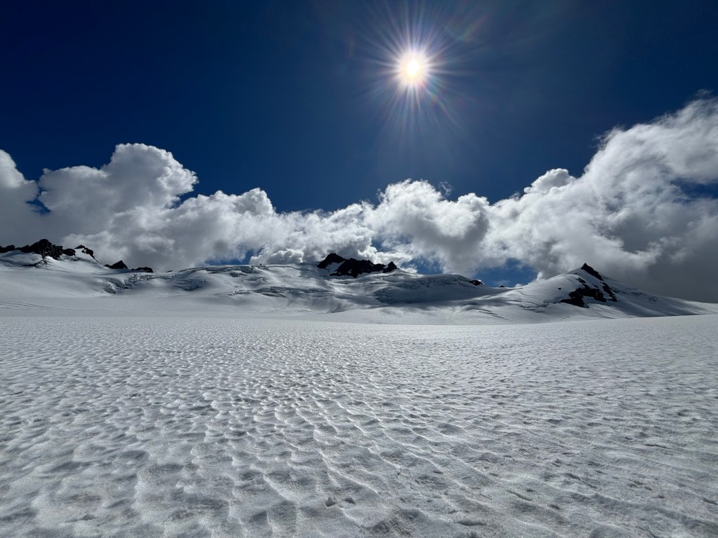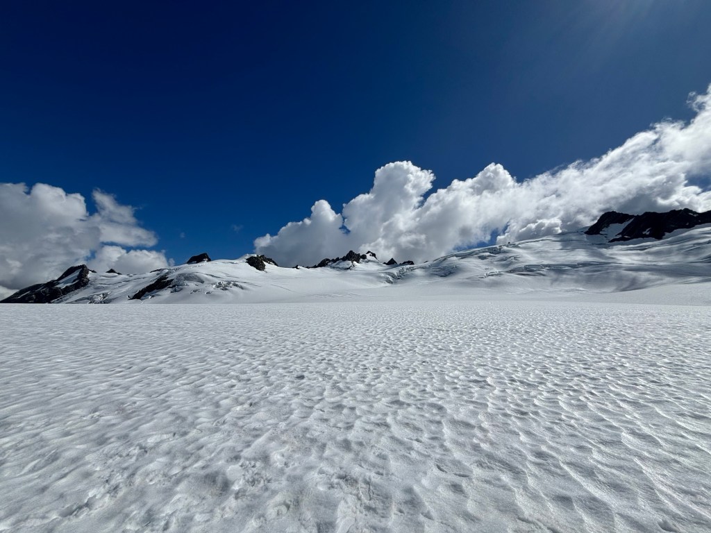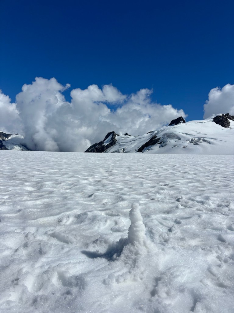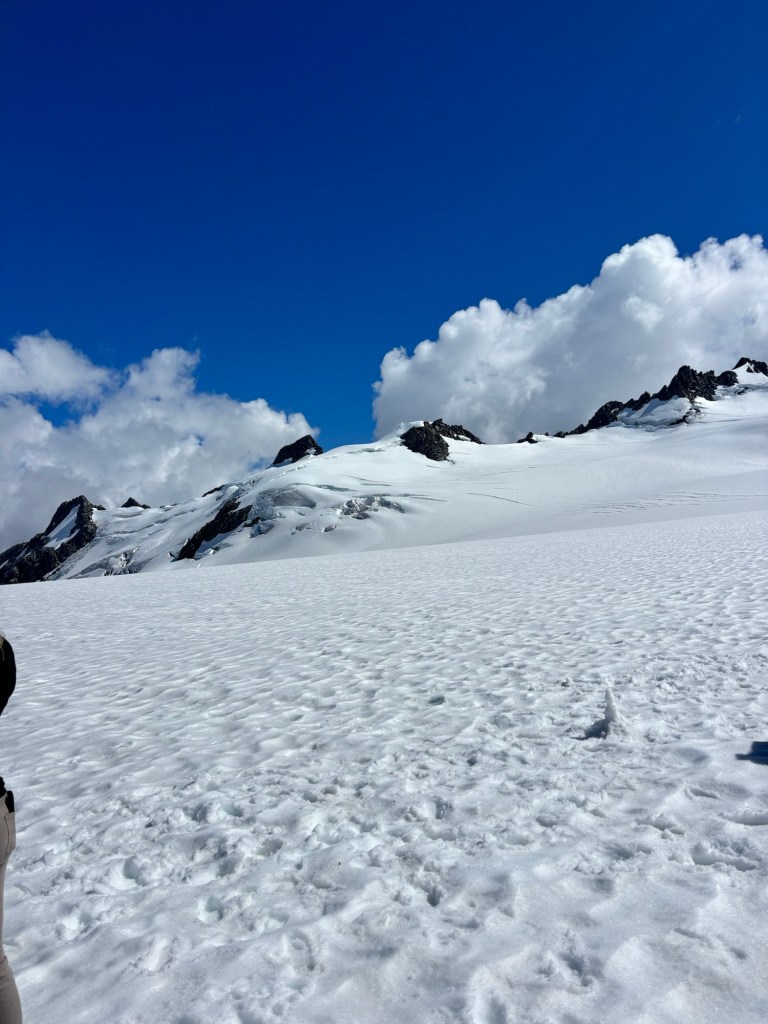 The ride took us over where we had been walking then up to the Glacier itself. We landed, and took pictures. The family that was with us made a wee snowman!