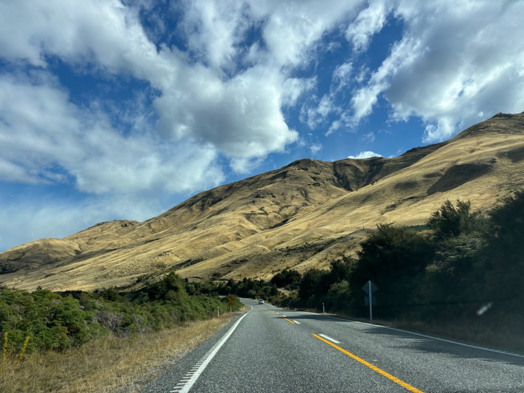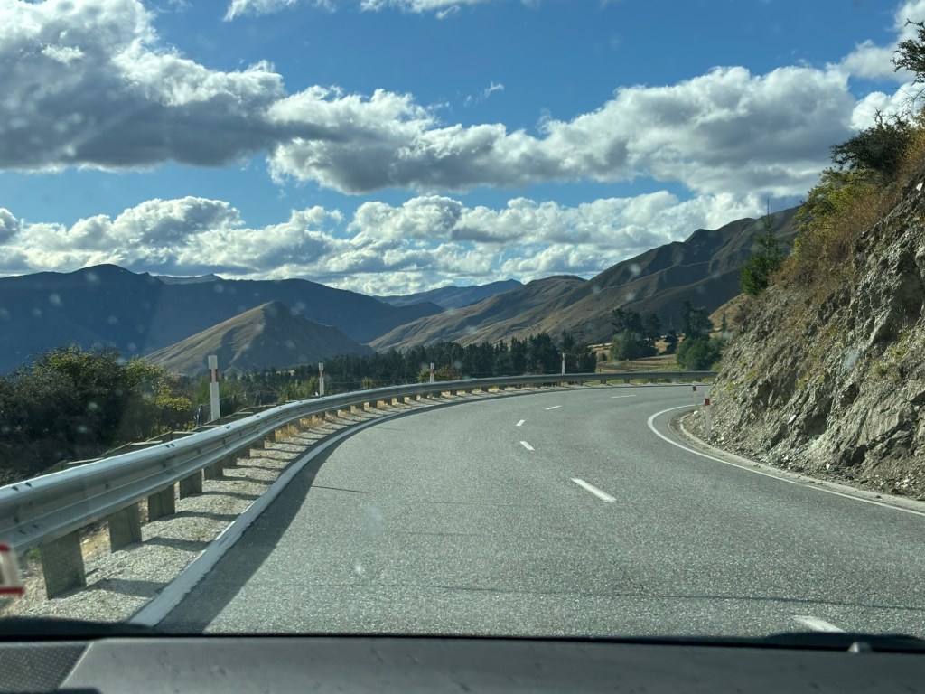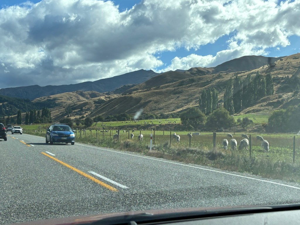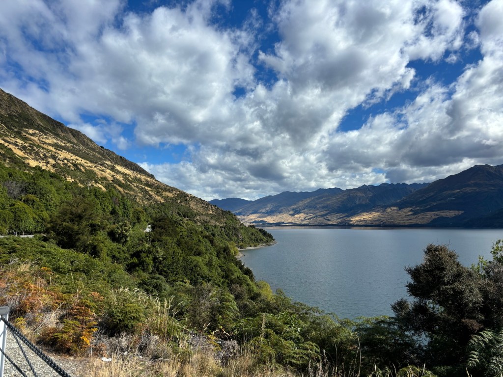 Along we traveled… thinking that we had seen the best of the best… but no, as we swung inland, towards Queenstown, we had to pass through the mountains, and past some stunning mountain lakes! (not too many of the mountains, I was driving, Rick was snoozing, recovering from the morning activities!)