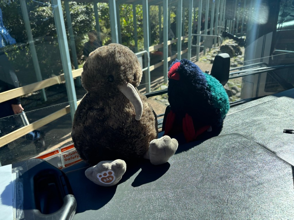 Our driver, Brendon, and his trusty stuffies, Kiwi and Takahe, drove us safely back the four hour drive.