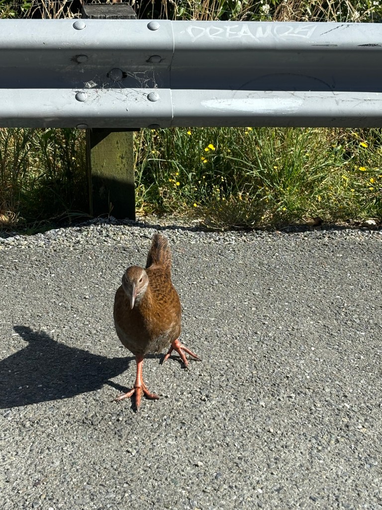 We did stop once, at a lookout, and were greeted by a protector of the view, a Weka, one of New Zealand’s flightless birds. He was interested in us… and scared at the same time… he came right to car. But as I crouched to take the pic… he backed up.