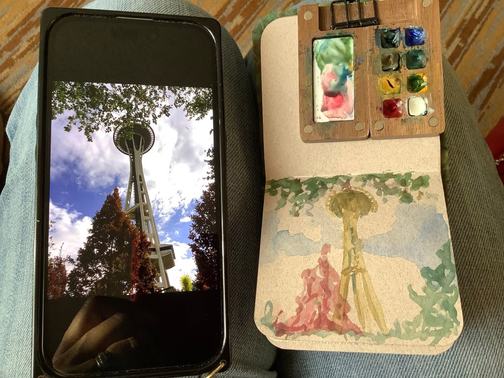 We headed to the tower, as we walked up the street I noticed that the Maple trees were starting to turn red… 150 days ago, we went to the tower in Seattle, and the leaves were turning red…if you remember my mini painting of that day 😉